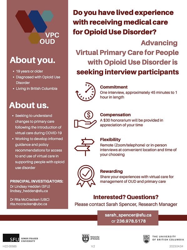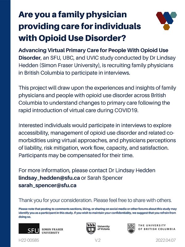 Advancing Virtual Primary Care for People with Opioid Use Disorder” (VPC OUD) explores how the rapid introduction of synchronous virtual interactions (videoconference and telephone consultations) during COVID-19 has affected primary care access and patient outcomes for people with opioid use disorder.